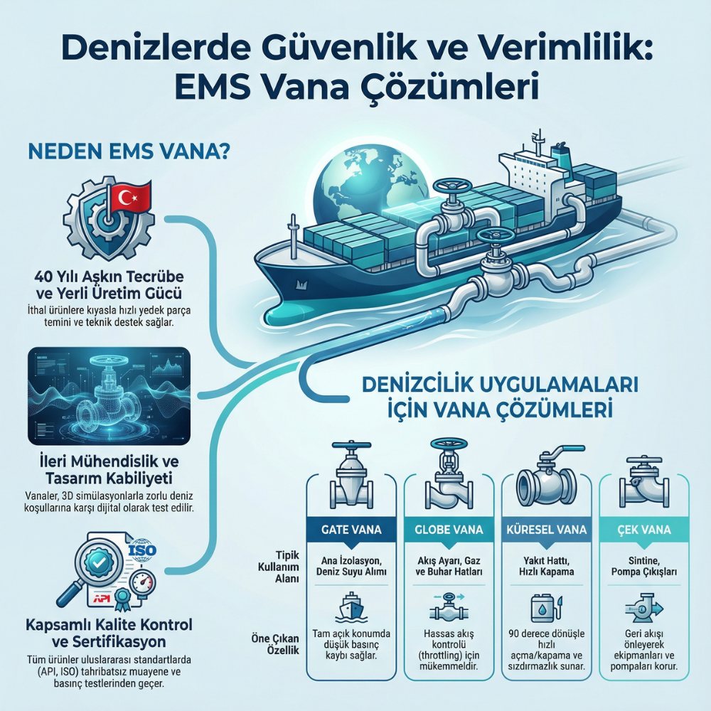 Denizcilik sektörü için vana çözümleri, açık denizlerin zorlu koşullarında, gemi inşa sanayisinin güvenliği ve operasyonel verimliliği için hayati bir önem taşır. EMS Vana olarak, 40 yılı aşan üretim yolculuğumuzda edindiğimiz tecrübeyle, en zorlu mühendislik projelerinde dahi kusursuz performans gösteren ürünler sunuyoruz. Sektörün ihtiyaç duyduğu dayanıklılık ve kaliteyi, %100 yerli üretim gücümüzle birleştirerek projelerinize değer katıyoruz. Hemen aşağıda yer alan iletişim butonu aracılığıyla uzman ekibimizle irtibata geçebilir, projeleriniz için en uygun çözümlere hızlıca ulaşabilirsiniz.