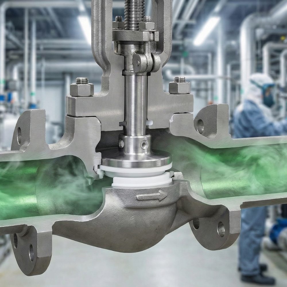 - Agresif Asitler ve Korozyon: Proses hatlarında kullanılan kimyasallar metal yüzeylerde ciddi korozyon riski yaratır. Bu zorluğa karşı Paslanmaz Çelik (304/316) gövdelerin yanı sıra, Monel ve Inconel gibi egzotik alaşımlar kullanıyoruz. Ayrıca PTFE (Teflon) contalı veya kaplamalı vana çözümlerimizle kimyasal dayanımı maksimize ediyoruz.