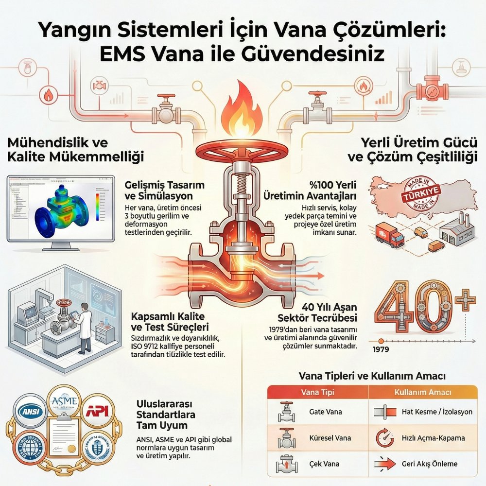 Yangın güvenliği, endüstriyel tesislerden ticari binalara kadar her yapı için hayati önem taşıyan, asla taviz verilemeyecek bir mühendislik alanıdır. Yangın sistemleri için vana çözümleri, acil durumlarda suyun veya söndürücü akışkanların en hızlı ve güvenilir şekilde sisteme iletilmesini sağlayarak hayat ve mal güvenliğini korur. EMS Vana olarak, 40 yılı aşan üretim yolculuğumuzda edindiğimiz tecrübe ile, en kritik anlarda sorunsuz çalışacak yüksek performanslı vanalar tasarlıyor ve üretiyoruz. Yangın tesisatlarınızın kalbini oluşturan bu ekipmanlar için %100 yerli üretim gücümüzle, uluslararası standartlarda çözümler sunuyoruz. Projenizin güvenliğini şansa bırakmayın; uzman ekibimizle iletişime geçerek en doğru çözüme bugün ulaşın.